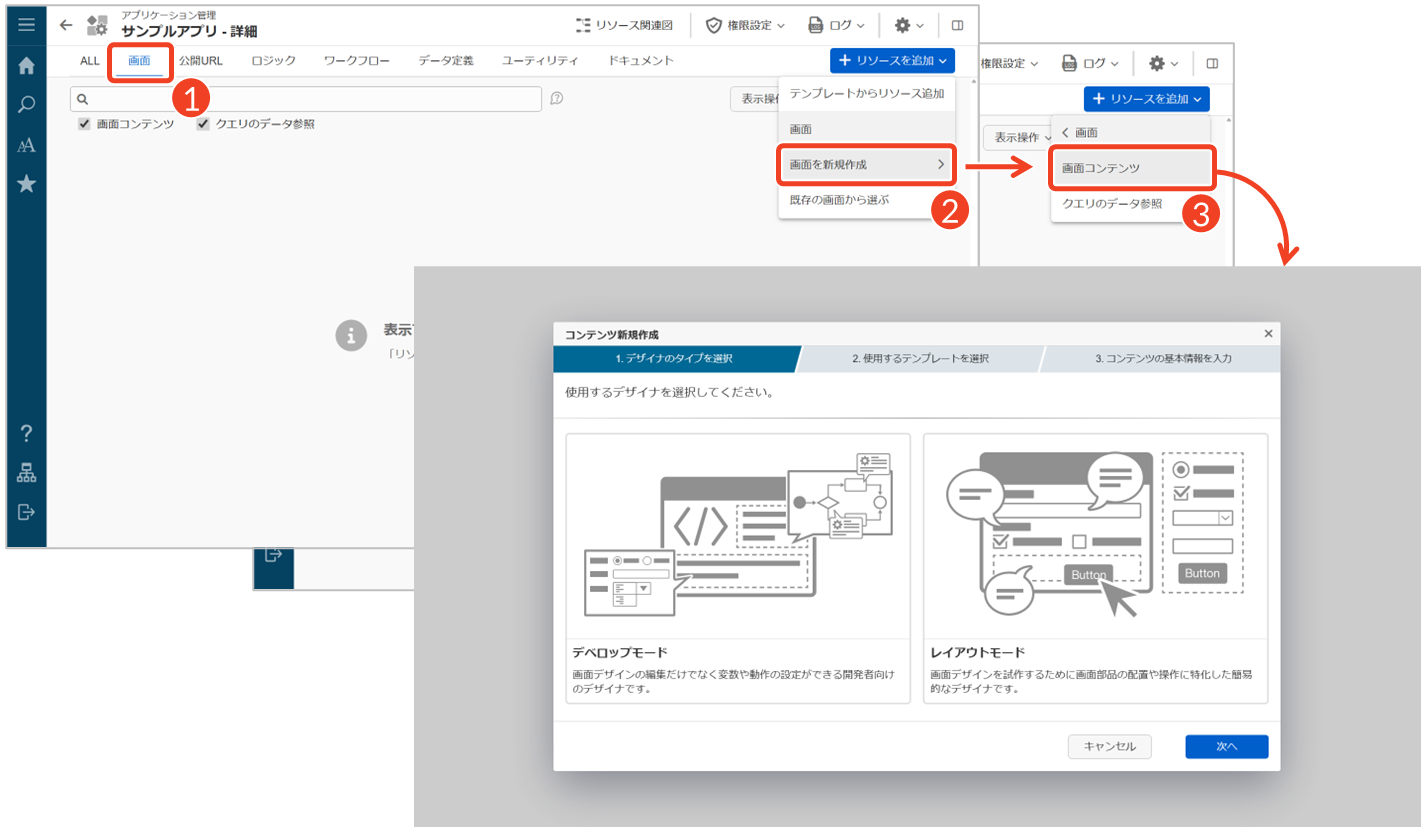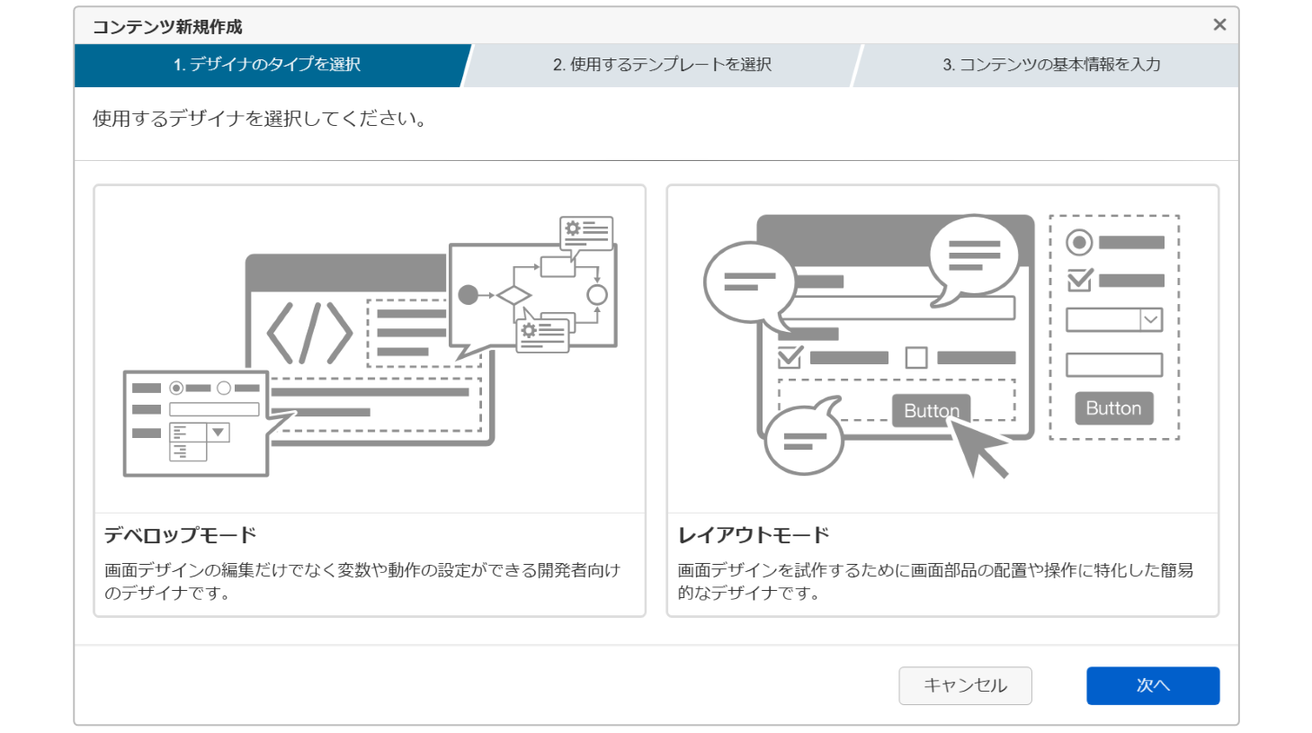 「コンテンツ新規作成」画面のフローに沿って、デザイナのタイプ選択、テンプレート選択、コンテンツ基本情報の入力を行い、画面コンテンツを作成しましょう。 「画面コンテンツの作成」では、デベロップモードをベースとしたコンテンツの作成手順について説明しています。画面作成の一連の流れを再度確認したい場合は、 「画面の新規作成」を参照してください。