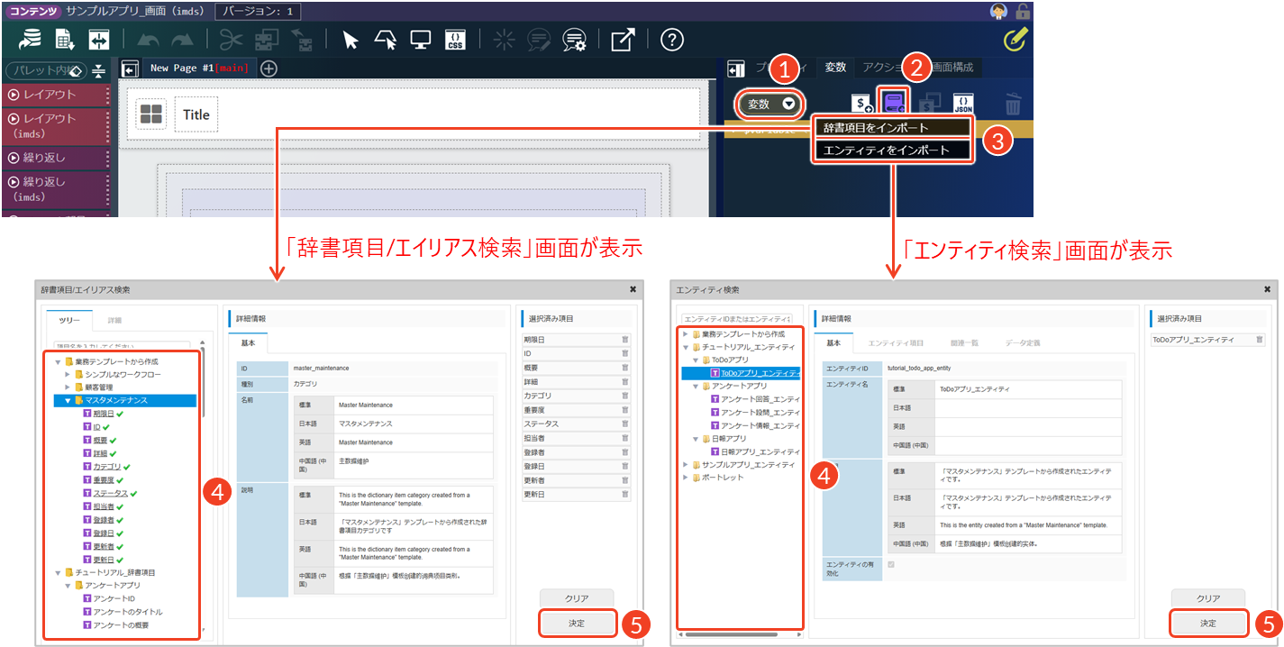 詳細は、「intra-mart Developer Portal - はじめてのIM-Repository」を参照してください。 - 画面変数に、辞書項目・エンティティ・列挙型をインポートする方法について、詳細は「intra-mart Developer Portal - 変数に辞書項目やエンティティをインポートしたい」もあわせて参照してください。