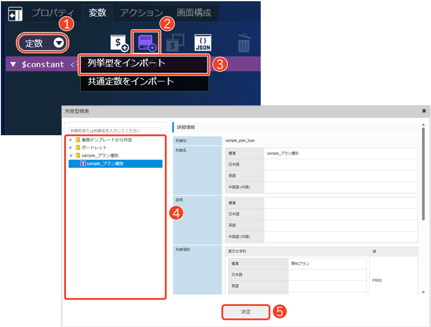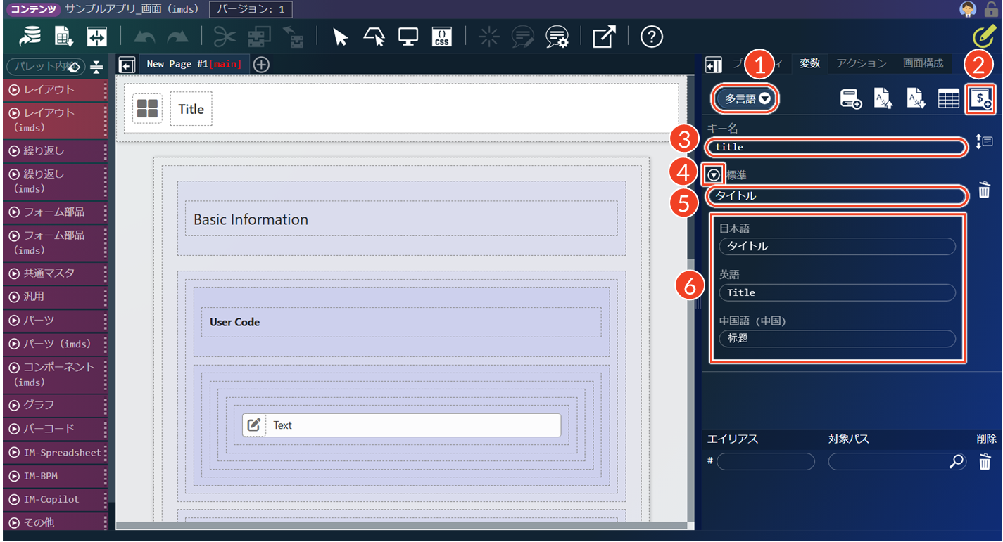 ここでは、画面変数(変数・定数・入力変数)に関する応用的な操作と、多言語変数の設定について説明します。
