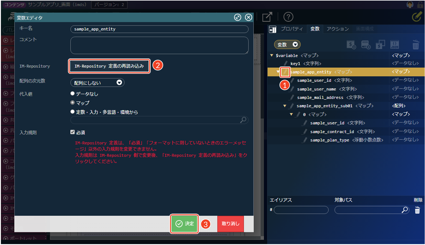 └ 「変数エディタ」ダイアログが表示されます。 - [IM-Repository定義の再読み込み]をクリックします。