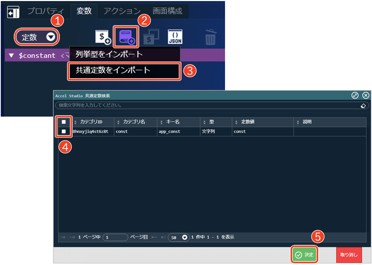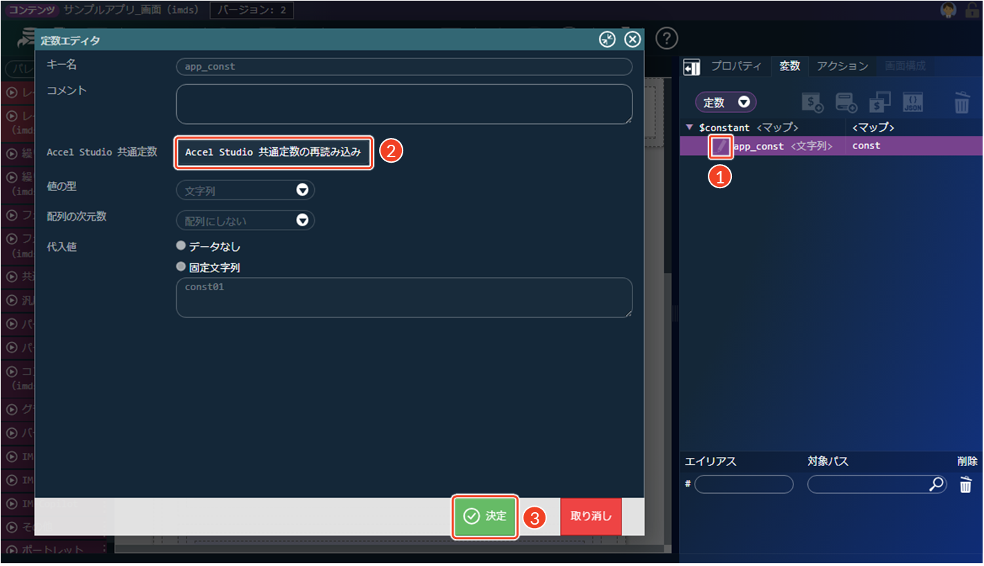 Accel Studioで定義された共通定数は、画面の定数としても利用できます。これにより、同じ定数を何度も作成する手間を省くことができます。