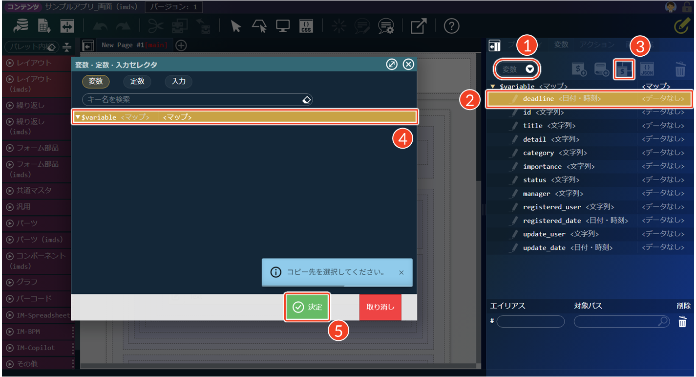 - 変数・定数・入力変数を設定した後は、必要に応じて各エレメントのプロパティで変数値を置き換えて使用してください。詳細は「画面レイアウトとデザイン調整 > エレメント固有プロパティの設定」を参照してください。