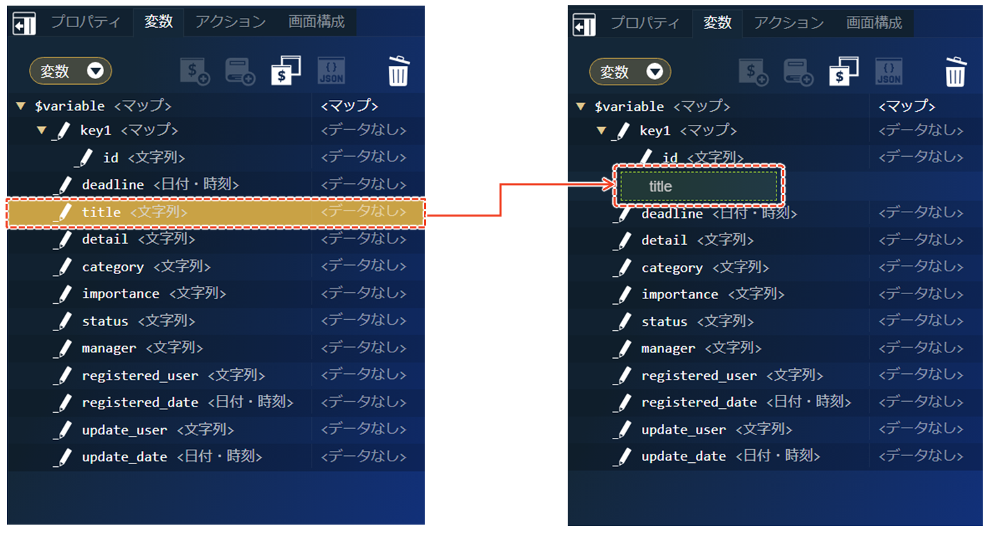 変数を選択し、移動したい位置にドラッグ&ドロップします。親要素と子要素の関係も、親要素をクリックしてからその配下にドラッグ&ドロップすることで変更できます。ただし、配列の要素を入れ替えたり、移動したりすることはできません。