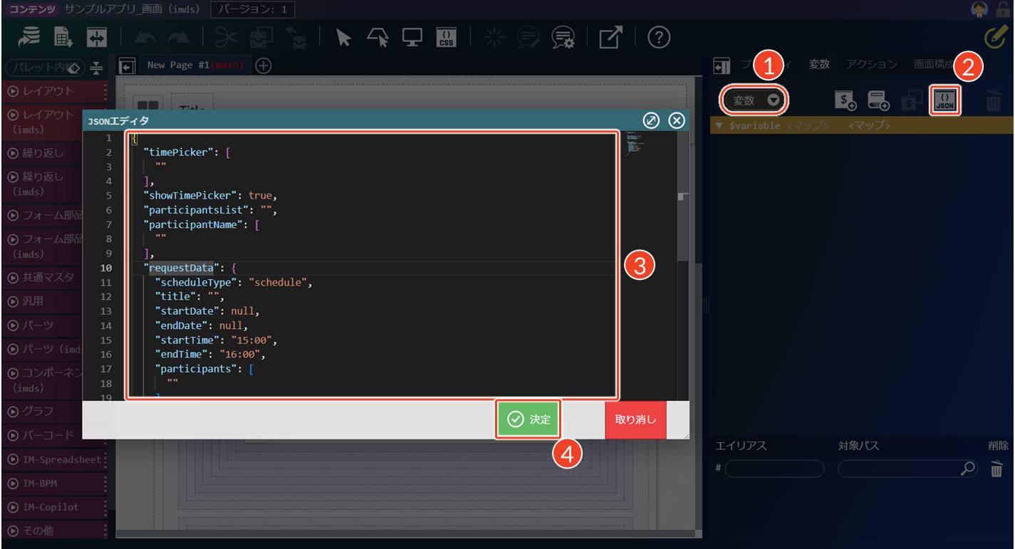 ただし、一部の値に関しては、意図しないデータ型に変換されてしまうことがあります。そのため、JSON形式で入力した後は、必ず正しいデータ型に変換されているかどうかを確認してください。詳細は「画面変数の編集 > IM-BloomMakerにおける特殊型の扱いと自動変換」を参照してください。