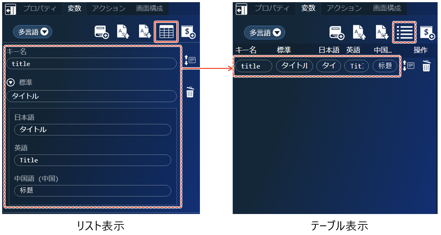 1つのアプリケーションを日本語以外の言語に切り替えて利用する場合は、多言語変数を設定します。