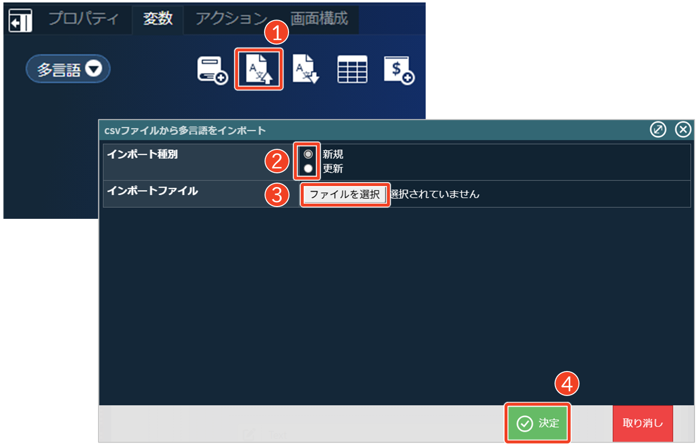 └ 「csvファイルから多言語をインポート」ダイアログが表示されます。 - 「インポート種別」で「新規」または「更新」を選択します。