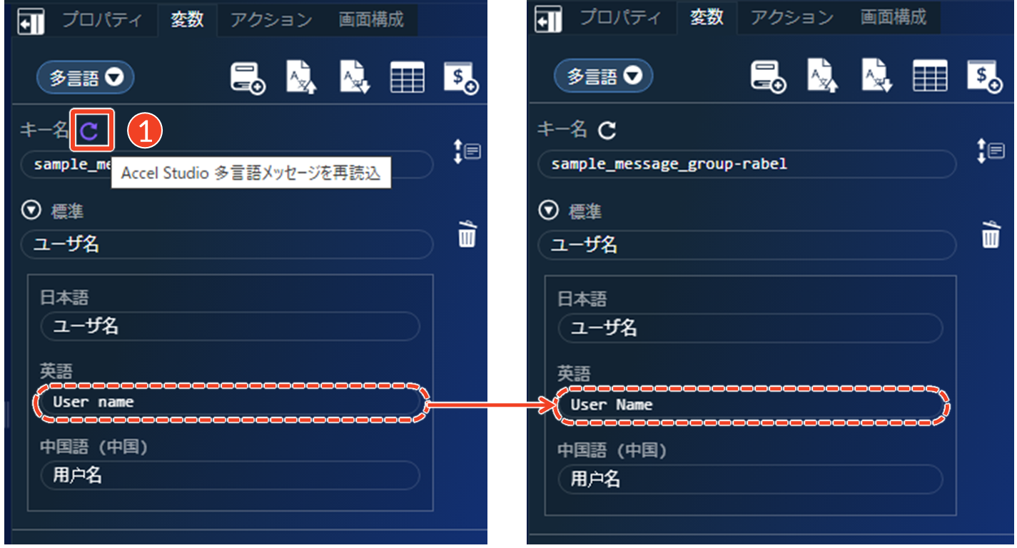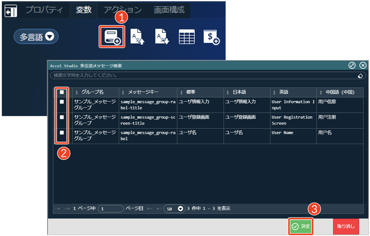 Accel Studioで定義された多言語メッセージは、画面の多言語変数としても利用できます。これにより、同じ多言語の文言を何度も作成する手間を省くことができます。