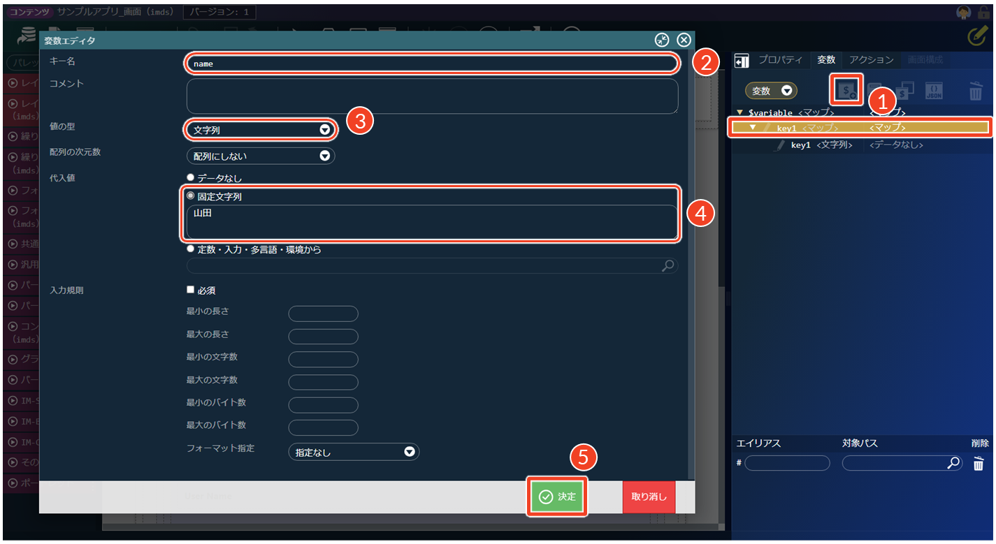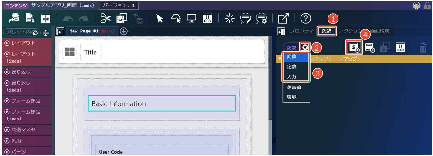 ここでは、画面変数(変数・定数・入力変数)の設定に関する基本的な操作について説明します。