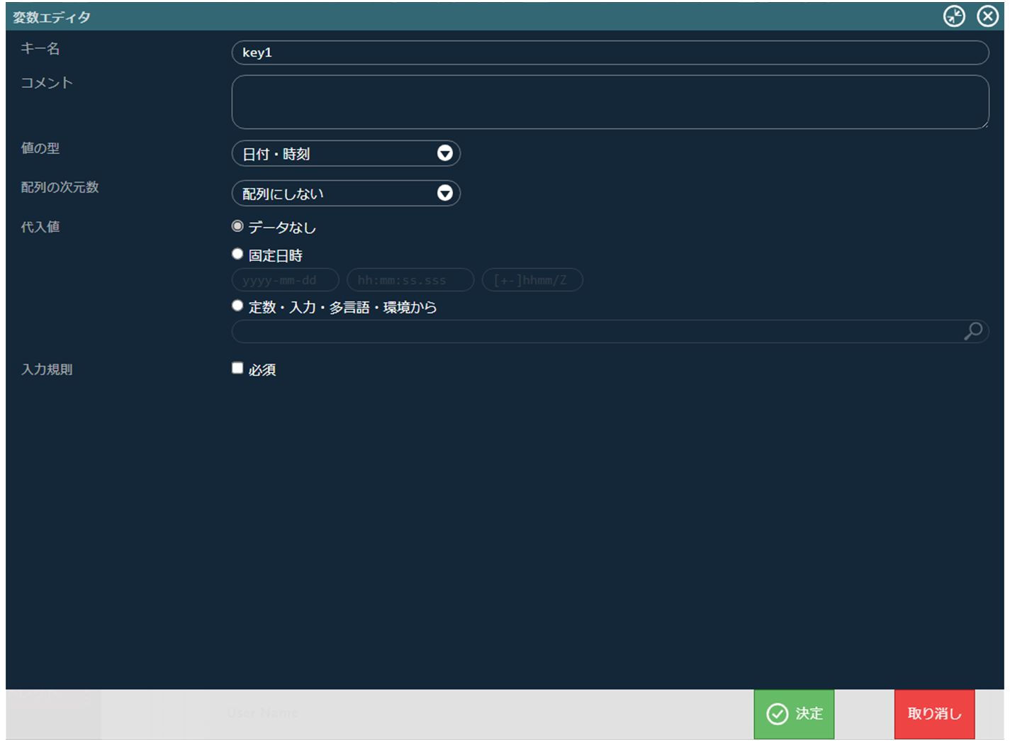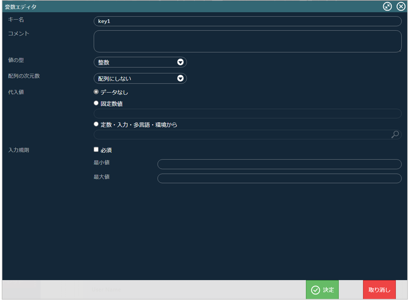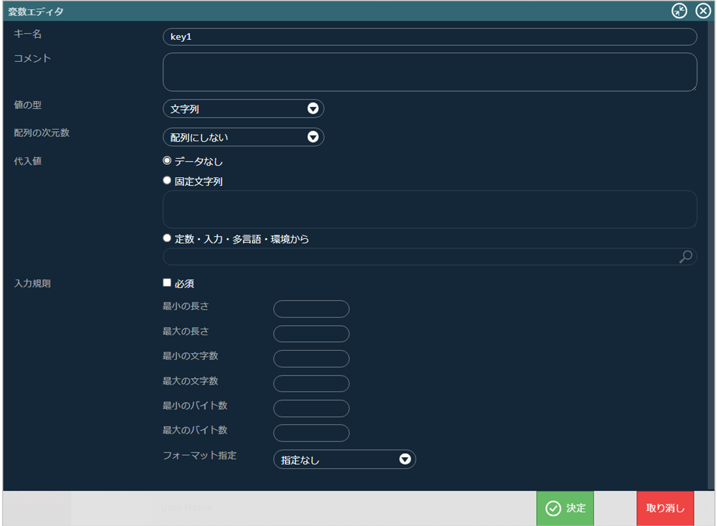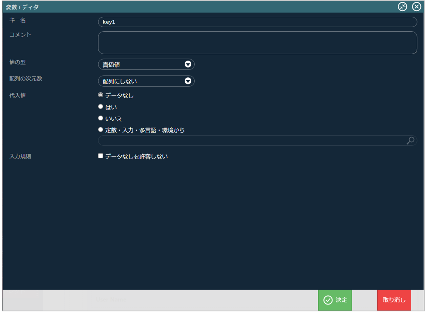 └ 「変数エディタ」ダイアログが表示されます。 - 「キー名」にわかりやすい名称を入力します。