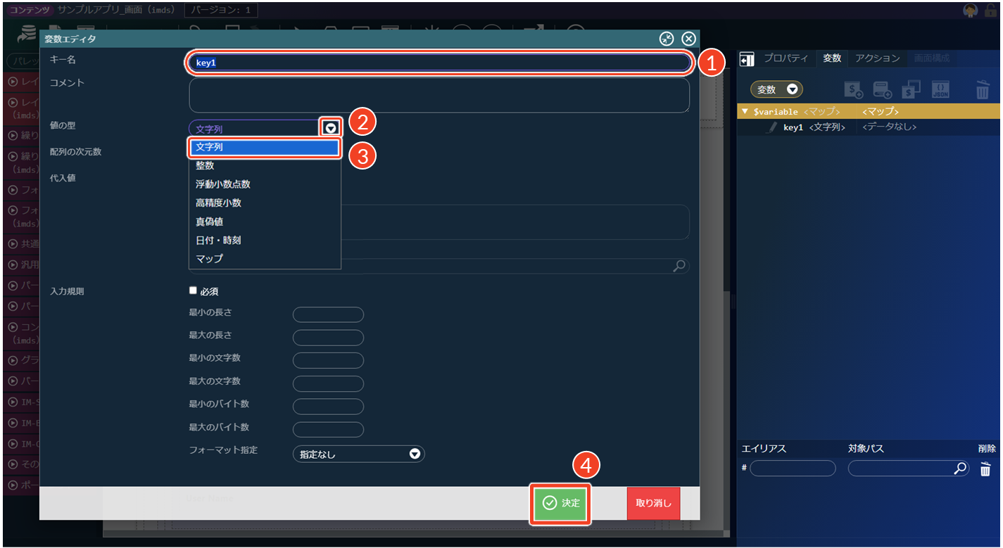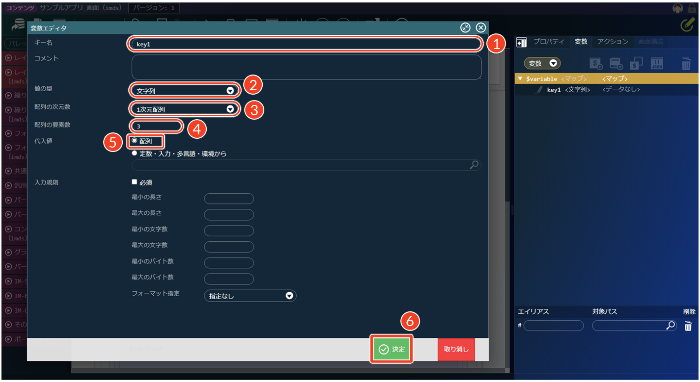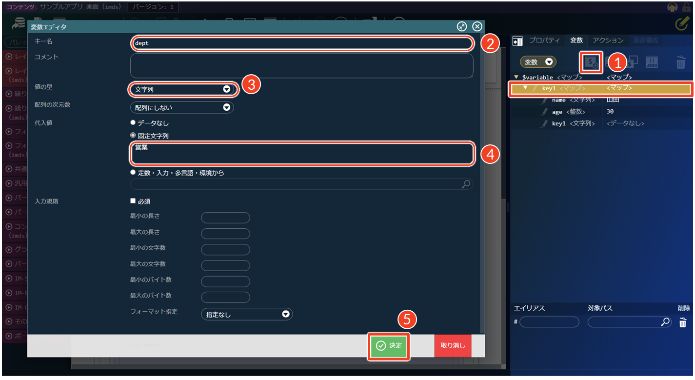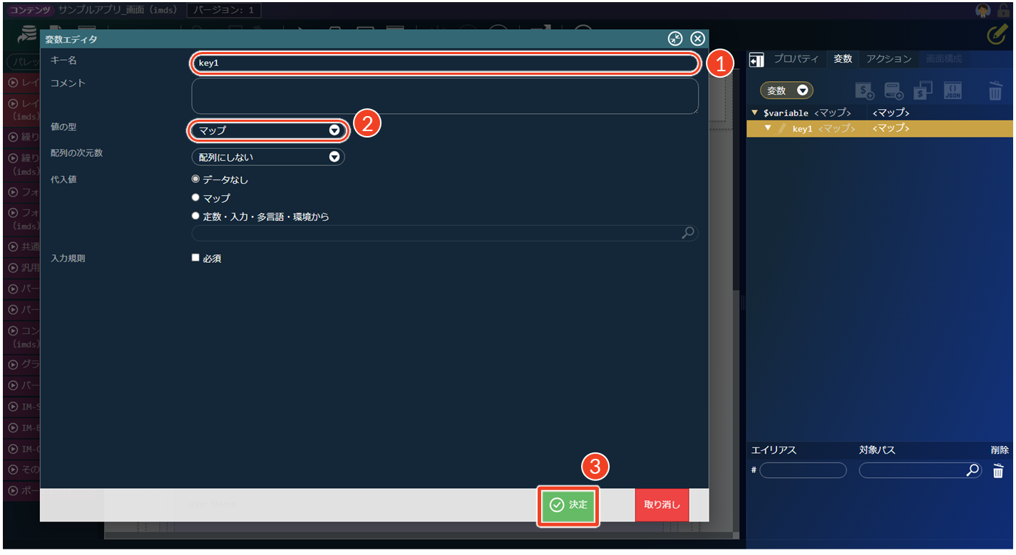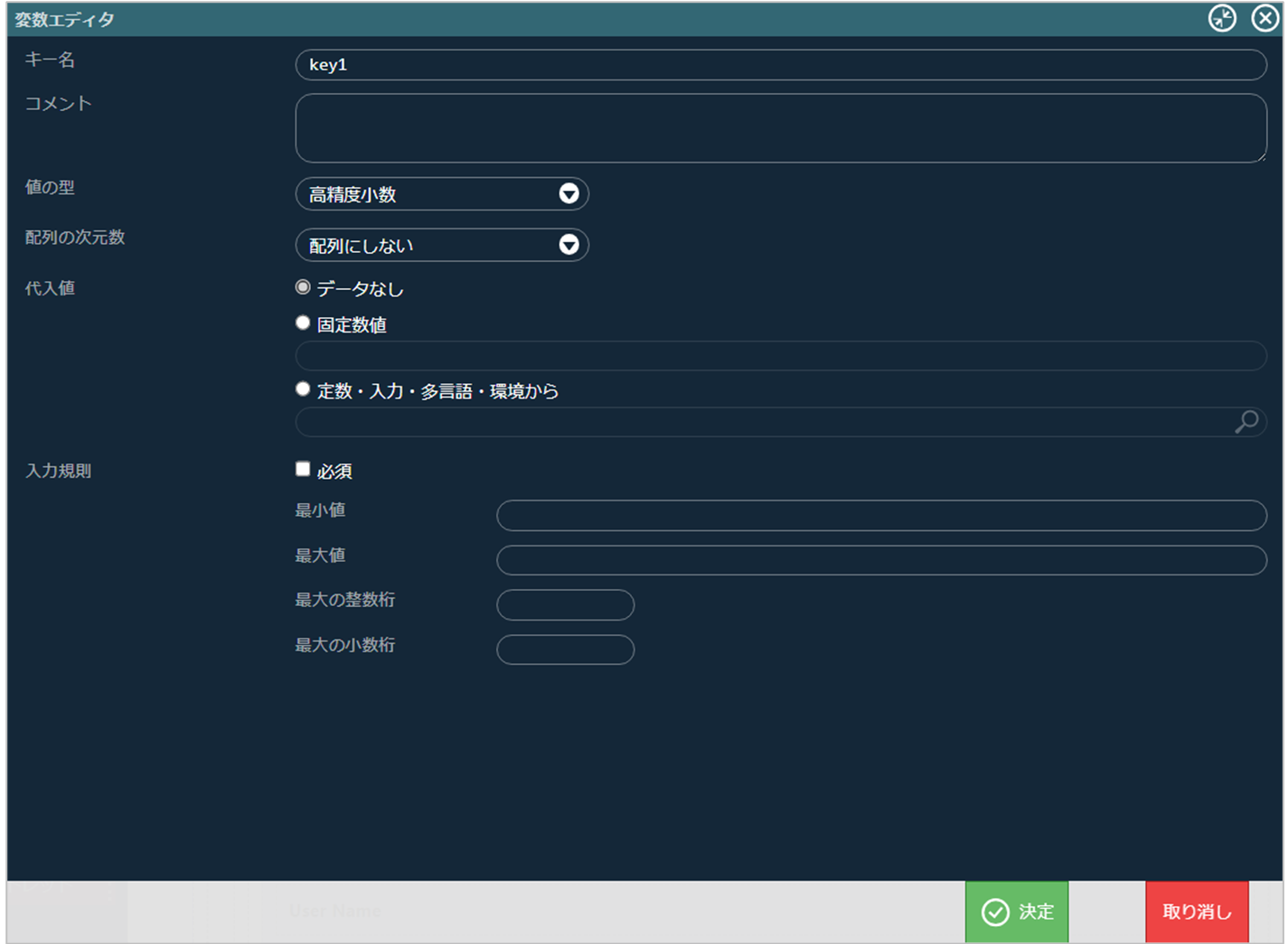 └ 「変数エディタ」ダイアログが表示されます。 - 「キー名」にわかりやすい名称を入力します。