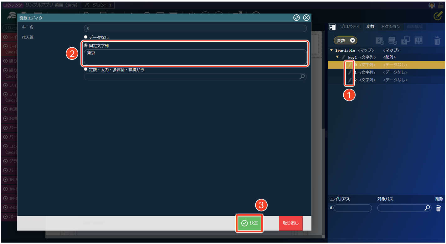 └ 「定数・入力・多言語・環境から」は変数のみ表示されます。 - [決定]をクリックします。