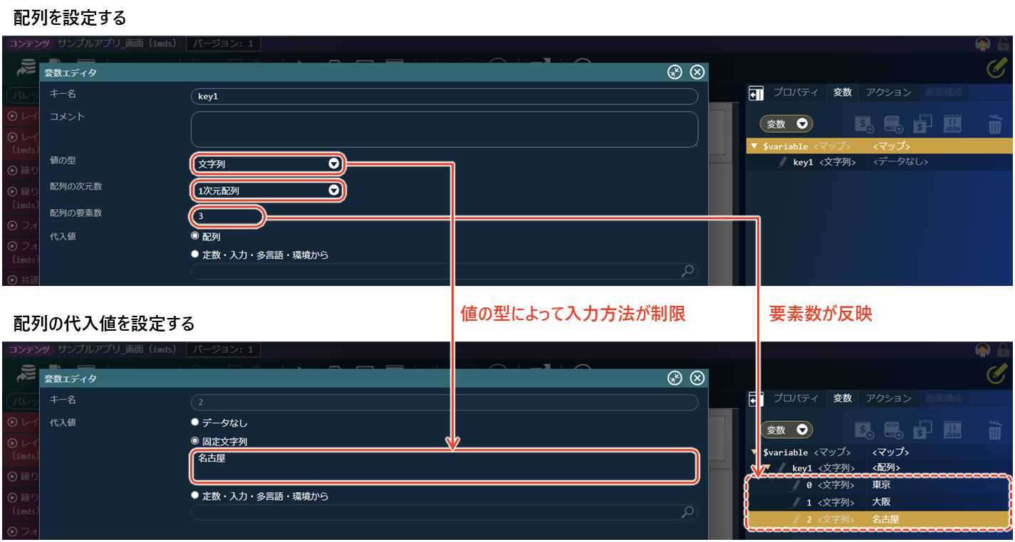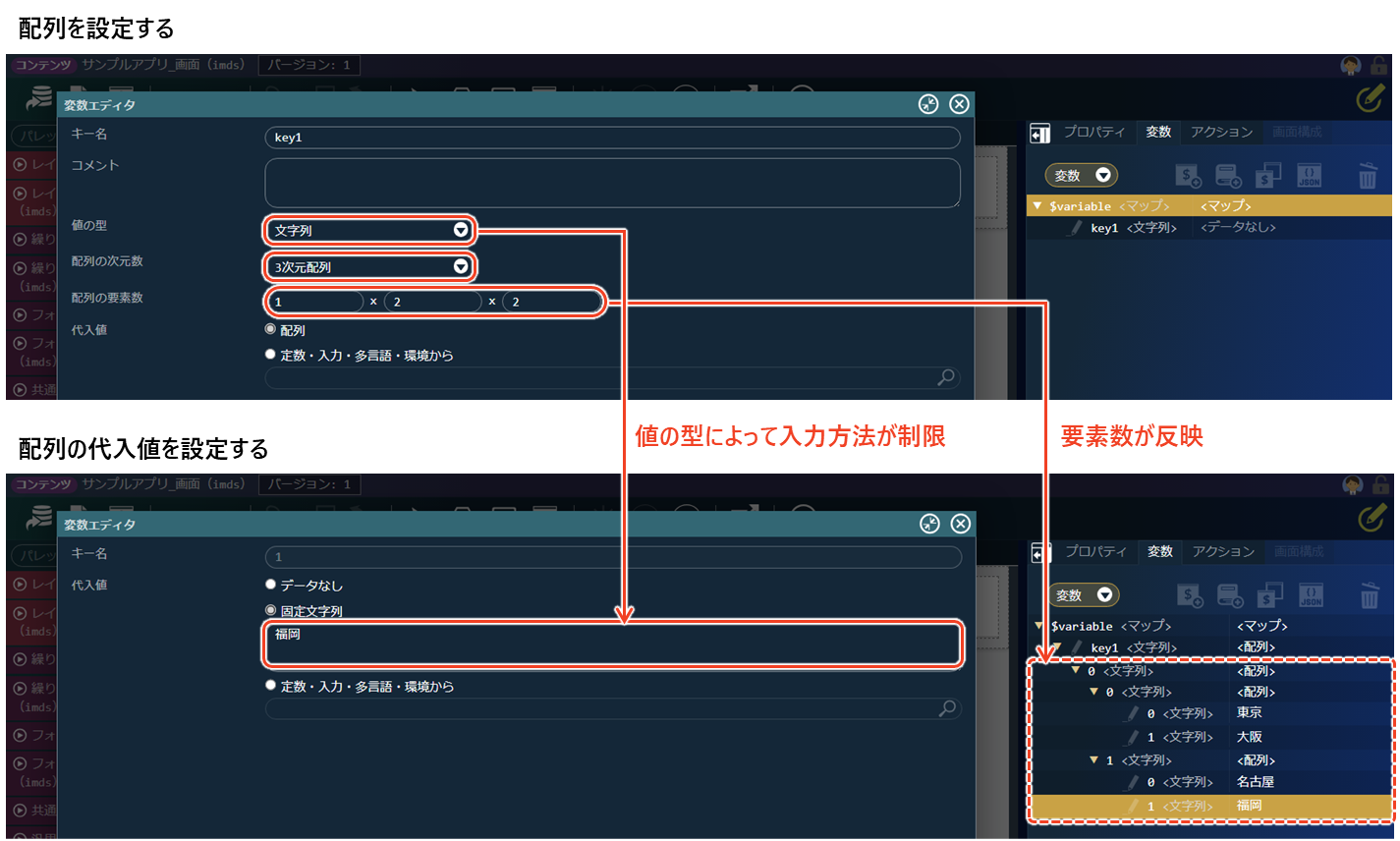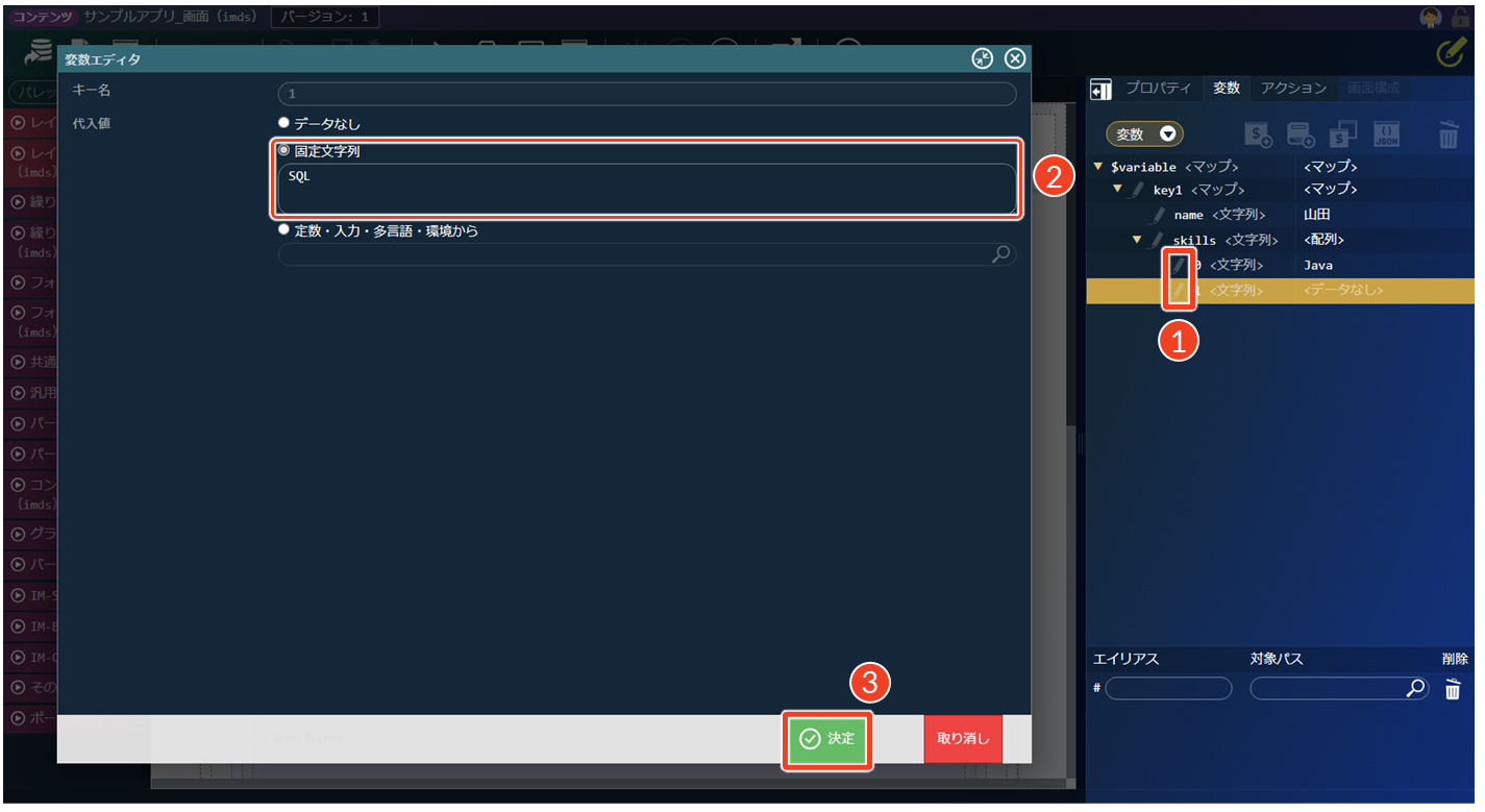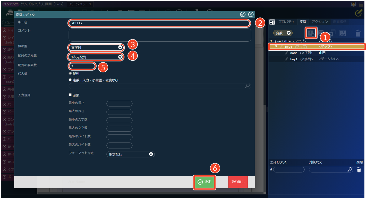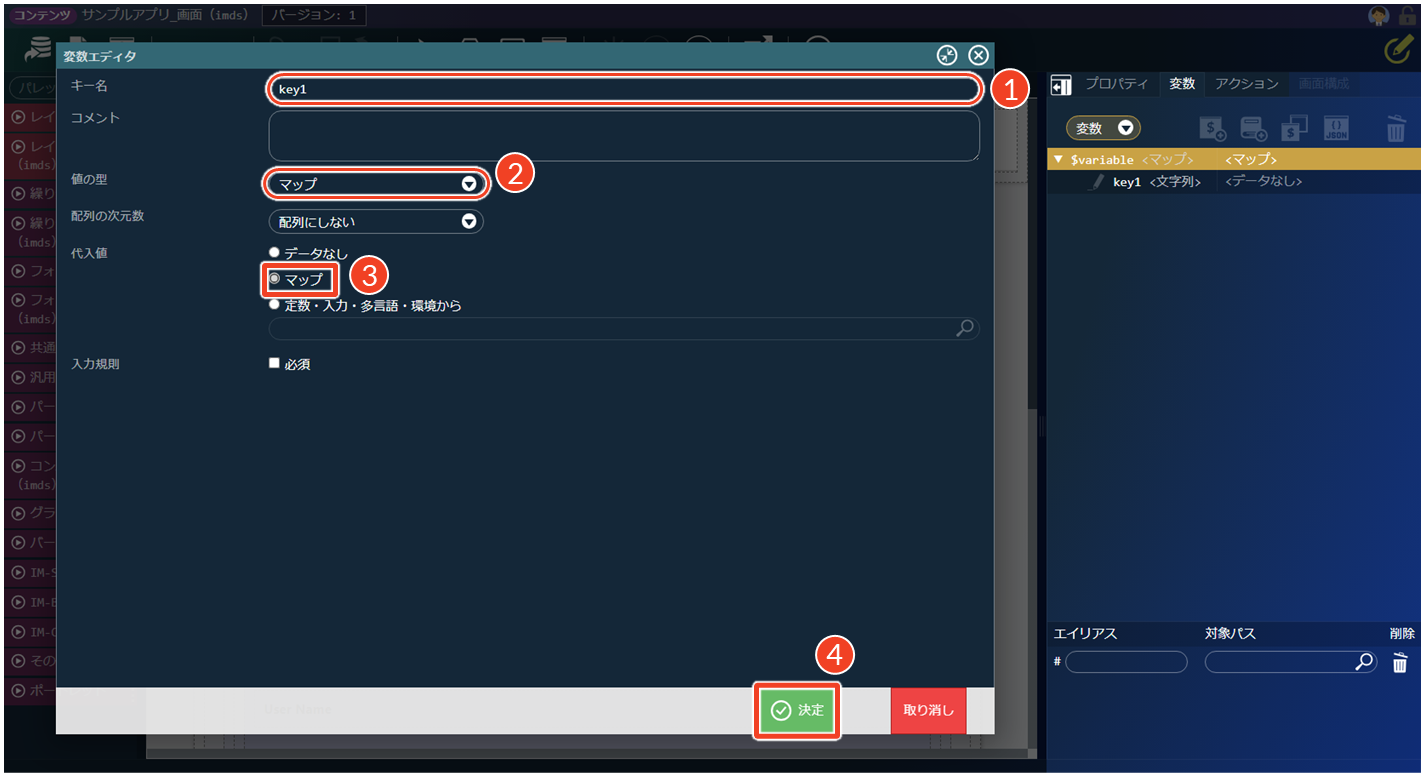 マップ型と配列型を組み合わせた変数設定について、詳細は「ローコード開発チュートリアルガイド - 5.2.4.3. 変数の設定」を参照してください。