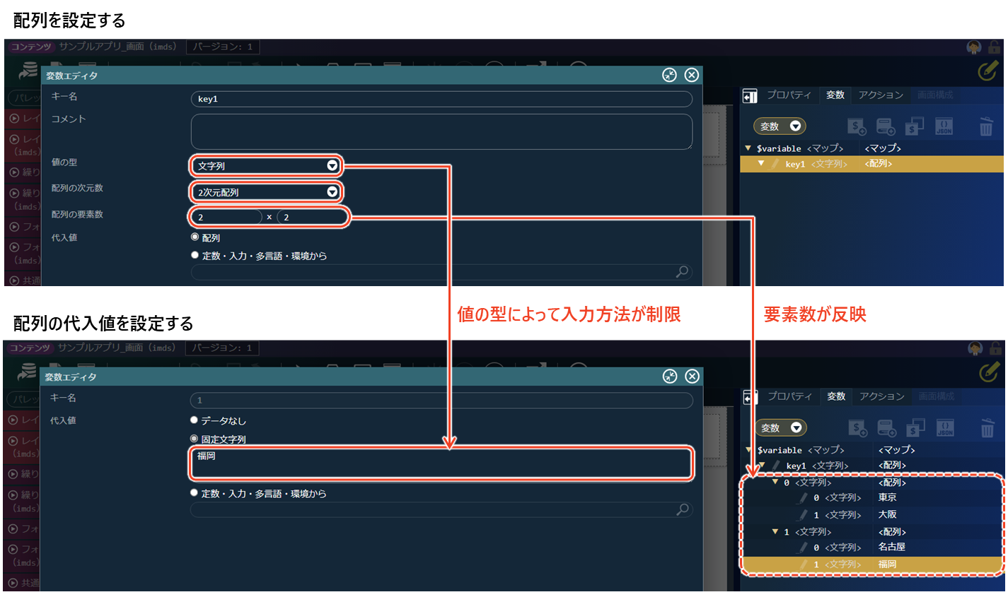 画面で扱うデータが複雑な構造を持つ場合には、マップ型と配列型を組み合わせて変数を設定します。 マップ型のキーと値の組み合わせの中に配列型を含めたり、配列の要素としてマップ型を持たせたりすることで、階層的なデータを表現できます。