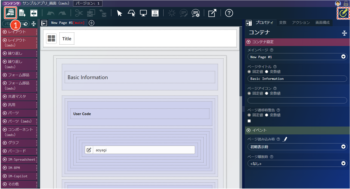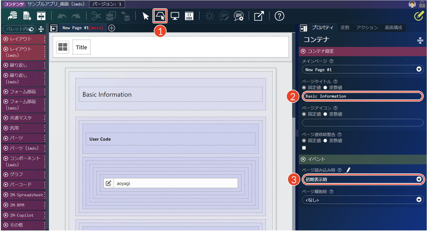 コンテナとは、画面上のエレメントをまとめて整理・管理する枠のようなものです。このコンテナを対象に、ページタイトルや初期表示時の動作など、ページ全体に関する設定を行います。