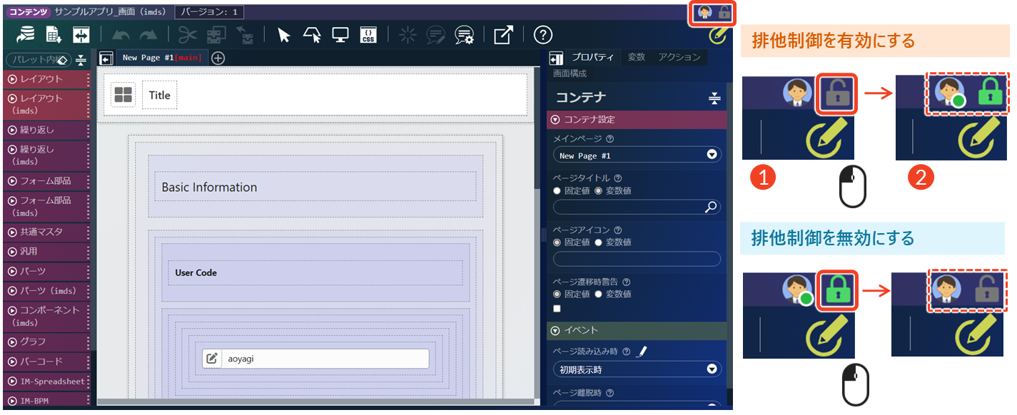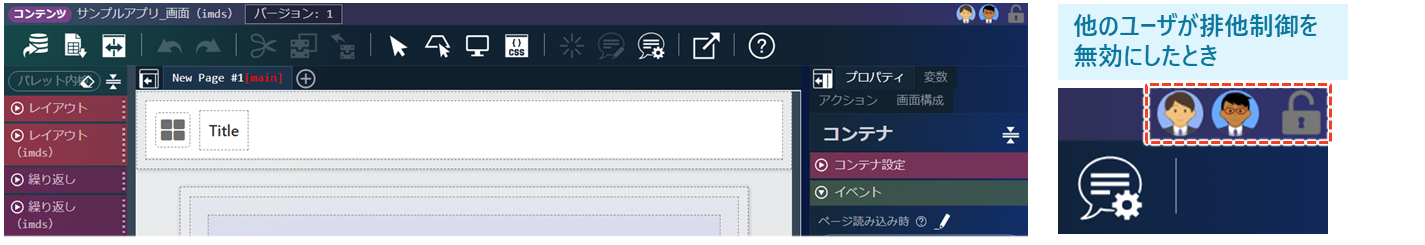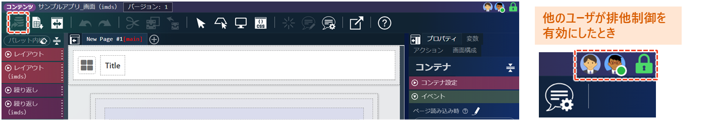 編集中の画面コンテンツに対して他のユーザが排他制御を有効にした場合、画面上に通知メッセージが表示され、どのユーザがロックを取得したかを確認できます。また、南京錠アイコンが緑色に変化し、ロックを取得したユーザのアイコンに緑色のバッジが表示されます。