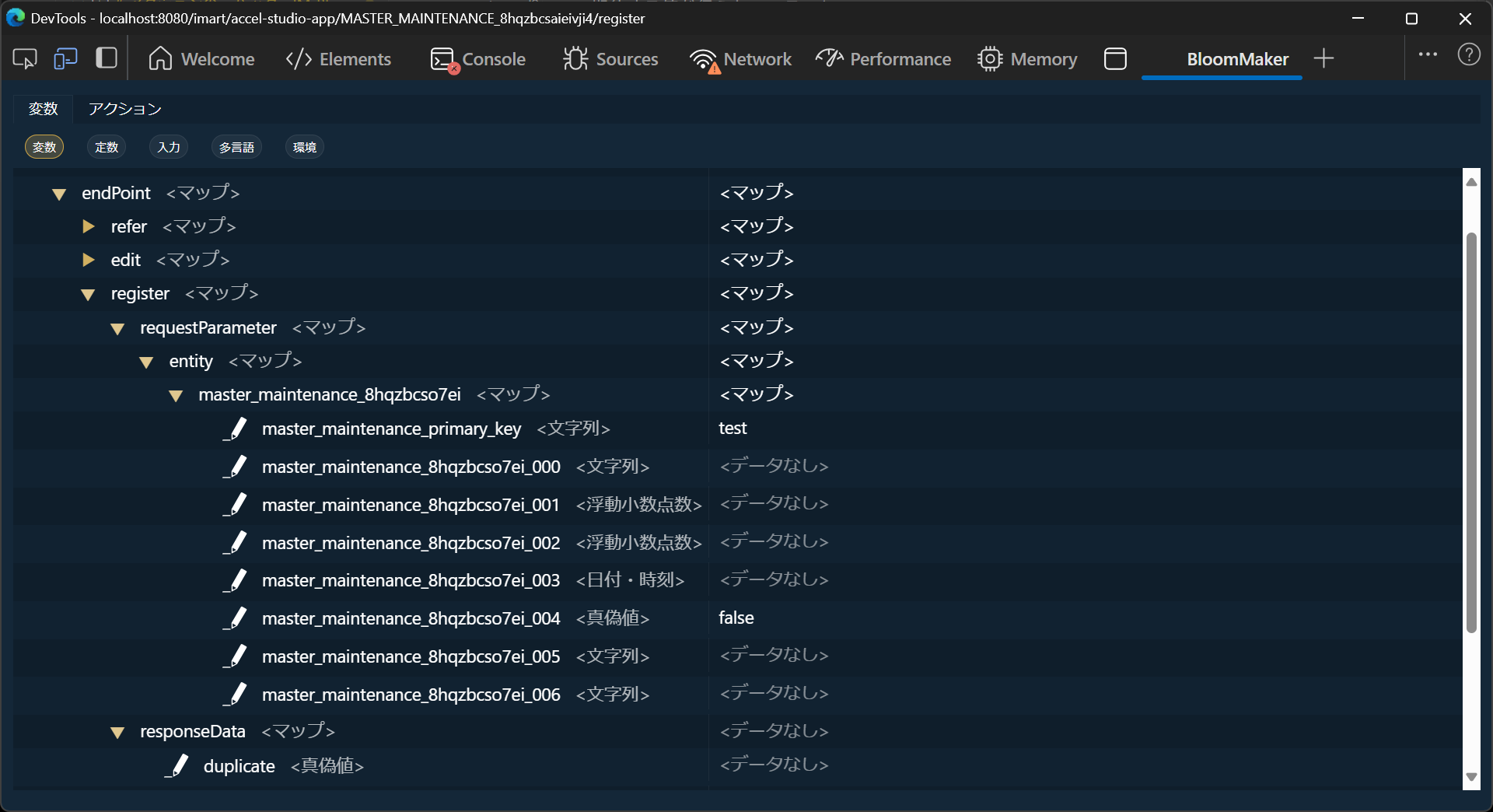 IM-BloomMakerのデバッグツールを使用し、変数の状態を確認します。